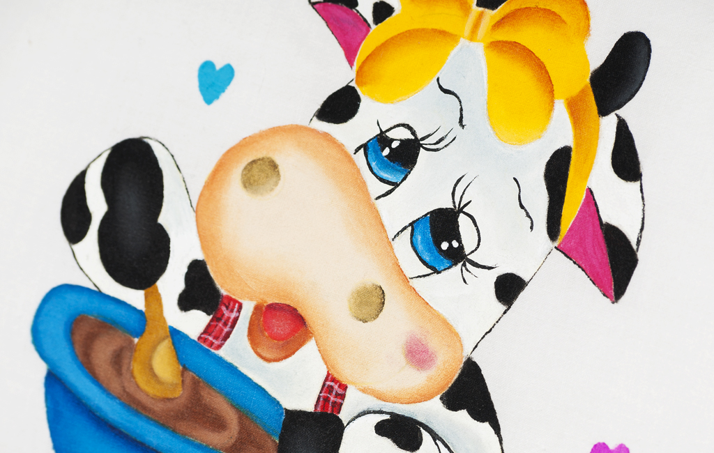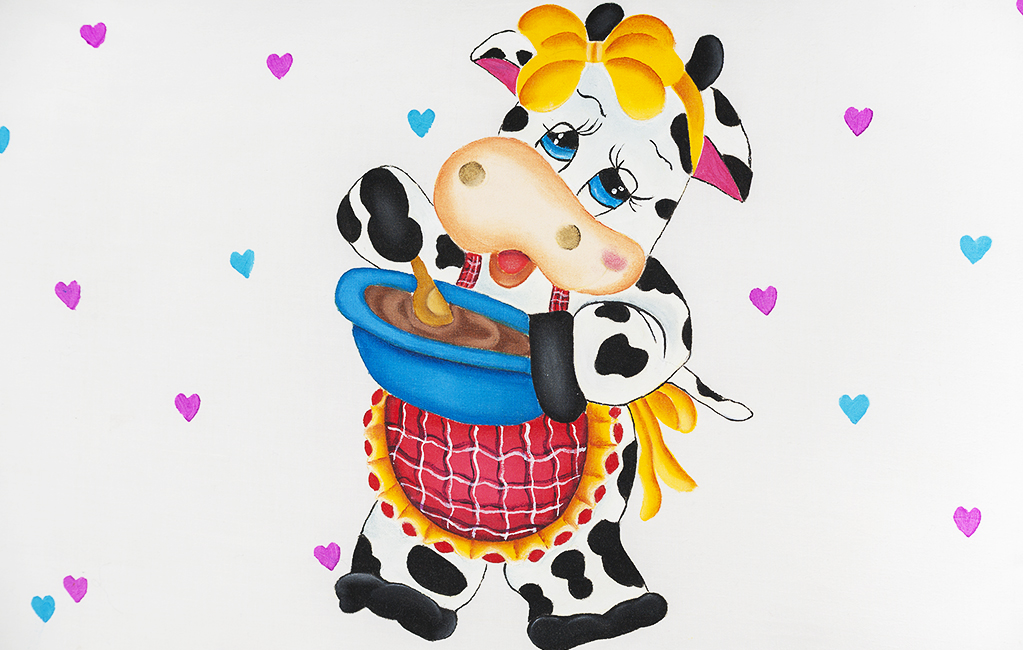 Lleva como decoración en la parte frontal una pintura de vaquita cocinera acompañada de corazones turquesas y magentas.