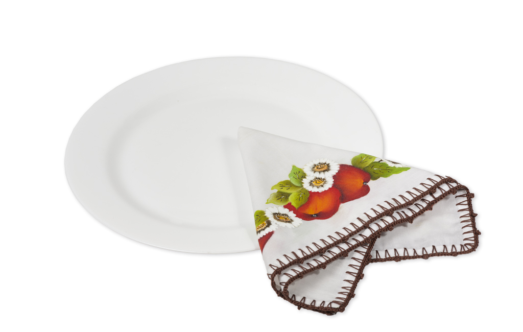 Con bordado en hilo perlado, lleva en ambos extremos un detalle pintado de manzanas y flores. Ideal para darle un punto de color a tu mesa.